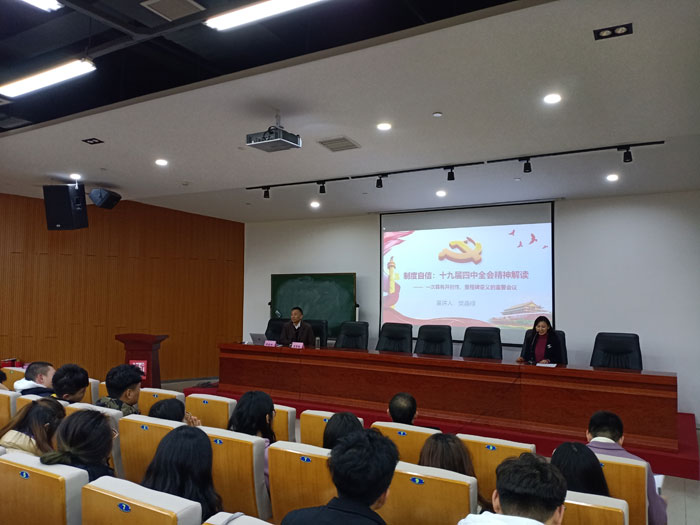 学院把学习贯彻党的十九届四中全会精神作为“不忘初心、牢记使命”主题教育重点任务,坚持原原本本学、持续跟进学、联系实际学。学院党委第一时间组织全院师生收听收看党的十九届四中全会新闻报道,召集领导班子成员、思政课教师等收看相关宣讲报告直播,下发《学习宣传贯彻党的十九届四中全会精神工作方案》以及《<中共中央关于坚持和完善中国特色社会主义制度、推进国家治理体系和治理能力现代化若干重大问题的决定>辅导读本》《党的十九届四中全会<决定>学习辅导百问》等学习辅导材料。