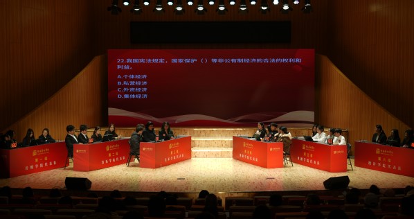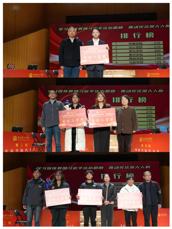 本次知识竞赛分为单选题、多选题、抢答题三个环节,题目涵盖了习近平法治思想、《中华人民共和国宪法》等内容。经过激烈角逐,最终传媒学院获得团体一等奖、设计学院和音乐学院获得团体二等奖,美术学院、舞蹈学院和戏剧学院获得团体三等奖。