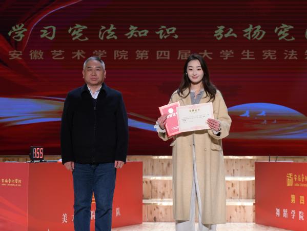 在近期公布的《安徽省教育厅关于公布第十届全省学生“学宪法 讲宪法”活动获奖名单的通知》中,我校学子成绩突出,获得一等奖1项,二等奖1项,优秀奖3项。陈文兵为一等奖学子颁奖。