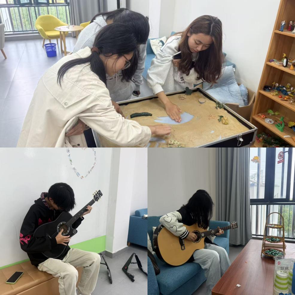 沙盘体验区里,同学们围聚在沙盘旁挑选沙具,在沙盘中构建属于自己的心灵世界。他们或专注地摆放着建筑模型,或认真地布置着自然景观,在沙与物的互动中,无声地探索内心的情绪与想法。在音乐疗愈区域,吉他的悠扬旋律不时响起,同学们或弹奏起喜爱的曲目,让音符在指尖跳跃,用音乐抒发情绪,或静静聆听,在舒缓的乐声中放松身心,让音乐的力量抚慰心灵的褶皱。