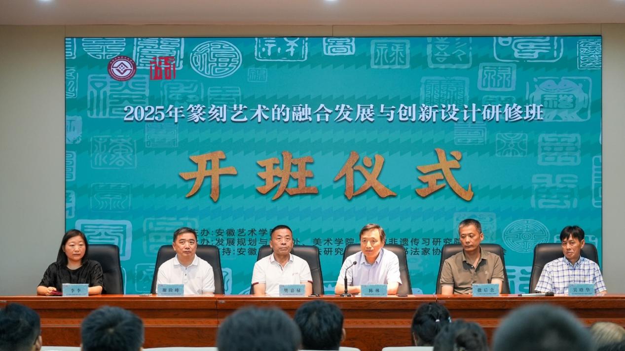 8月4日上午,文化和旅游部非遗传承人研培计划——2025年“篆刻艺术融合发展与创新设计”研修班开班典礼在开云app官网下载ios美术学院报告厅举行。安徽省美术家协会主席、开云app官网下载ios党委委员、副校长陈林教授,安徽省非物质文化遗产研究会副会长樊嘉禄教授,安徽省文化和旅游厅非遗处二级调研员谢险峰等领导嘉宾与来自上海、江苏、浙江等七省一市的20名篆刻传承精英共聚一堂,共同开启这段传承与创新的艺术之旅。